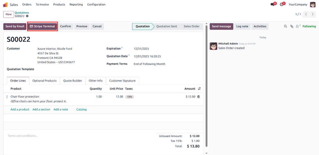 - Also, on a sales quotation or order, click the stripe terminal button.