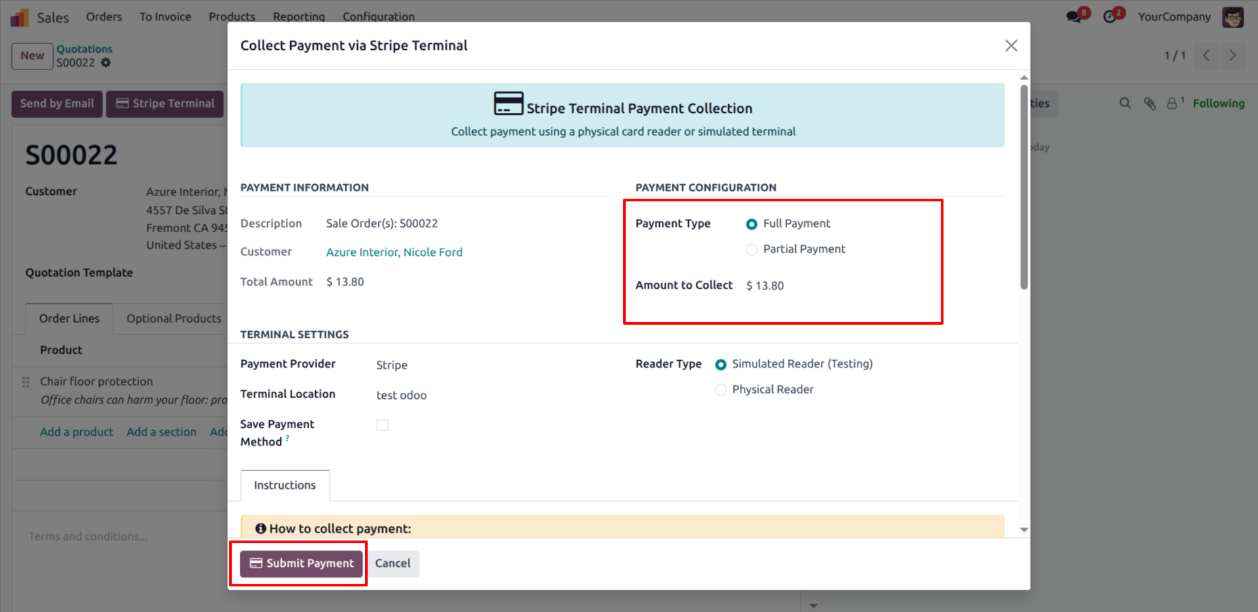 - The payment wizard appears, allowing you to select the amount and terminal reader. Submitting the payment creates a payment transaction in Odoo and sends a payment request to the selected physical terminal.