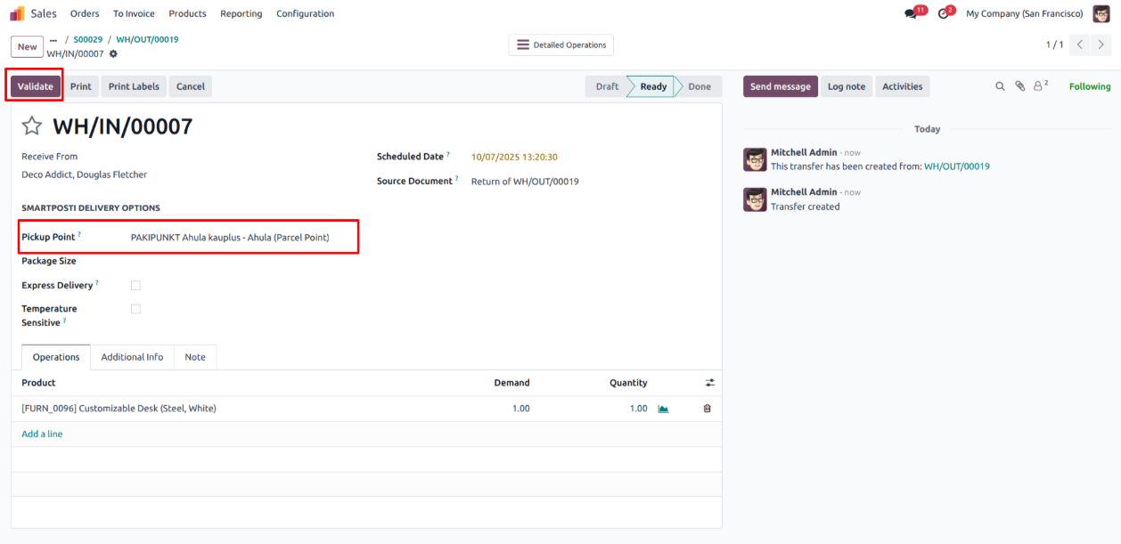 - After sales order confirmation, Now inside the Delivery Order select the Pickup Point and click Validate button.