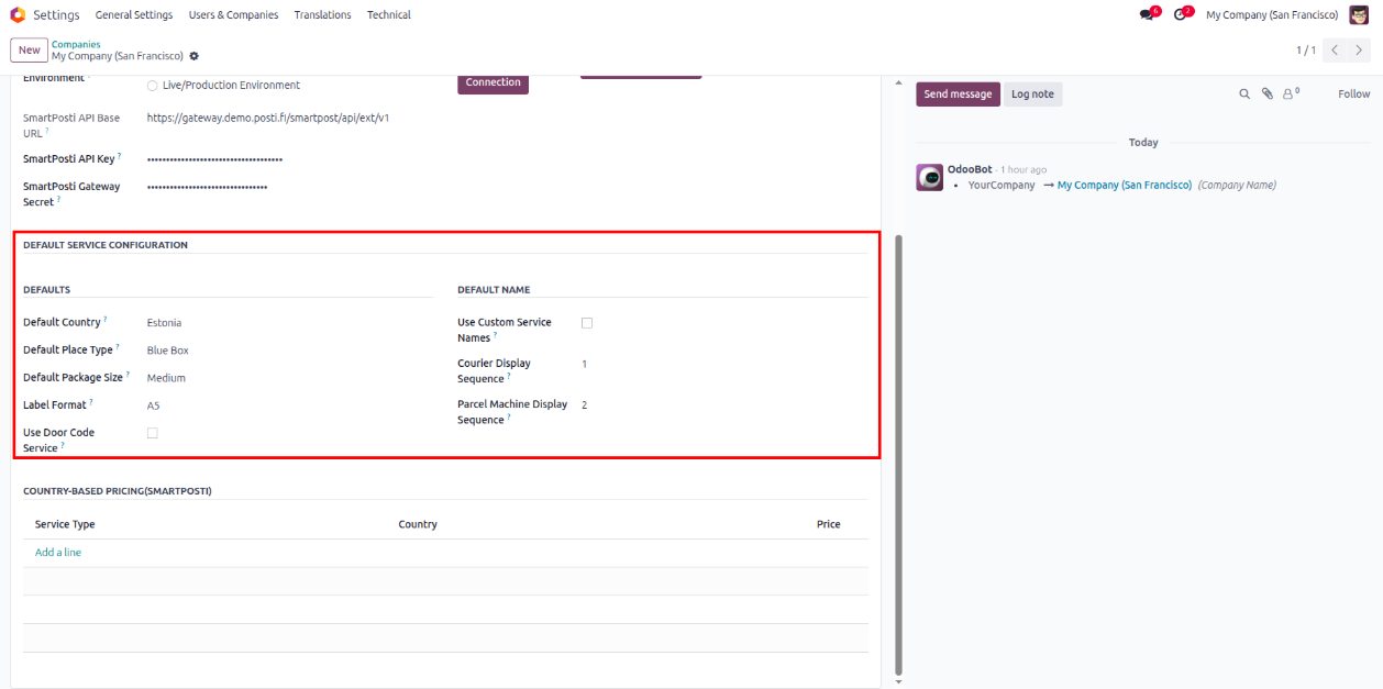 - Here user need to configure the pricing country wise under Country-Based Pricing(Smartposti) in the page SmartPosti Configuration inside company.