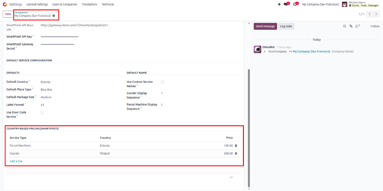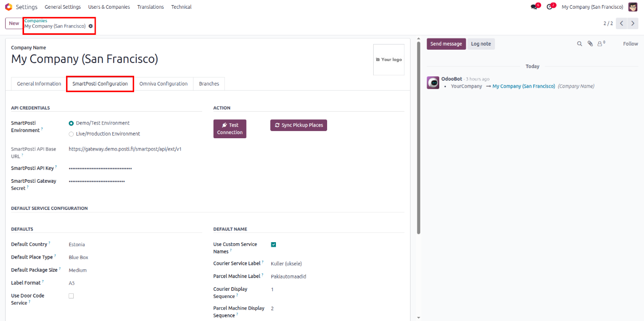 - Navigate to Settings >> Companies there user will find SmartPosti Configuration & Omniva Configuration.